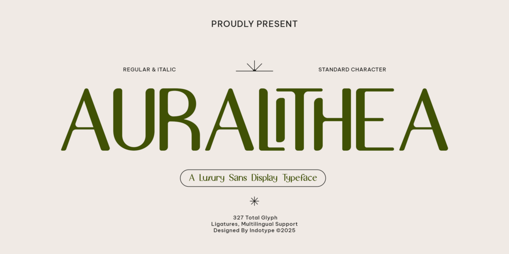Auralithea is the epitome of sophisticated minimalism, a luxury sans-serif display typeface designed to elevate your brand with understated elegance. Characterized by its clean lines, refined proportions, and impeccable balance, Auralithea exudes a sense of exclusive quality and modern prestige. It masterfully blends clarity with character, making it perfect for brands that wish to communicate authority and style without saying a word. This comprehensive family includes both Regular and Italic styles, offering tonal versatility for your designs. With an extensive set of 327 total glyphs, advanced typographic features like ligatures, and full multilingual support, Auralithea is as functional as it is beautiful. It is the definitive choice for high-end fashion labels, luxury product packaging, sophisticated editorial headlines, and any identity that demands a timeless, global appeal.